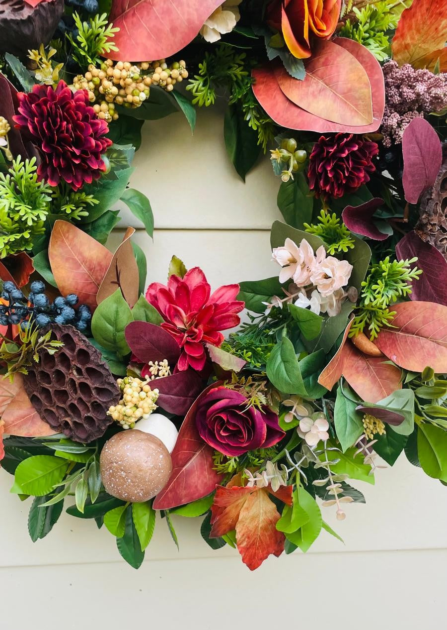 This beautiful wreath captures the rich and sophisticated colors of the autumn season. It features a lush base of large leaves in shades of deep green and warm rustic red. The design is filled with a stunning mix of floral types including deep burgundy chrysanthemum-like flowers, soft orange rosebuds, and clusters of dark berries. Natural elements like rustic lotus seed pods and large, speckled orbs add unique texture and authenticity.