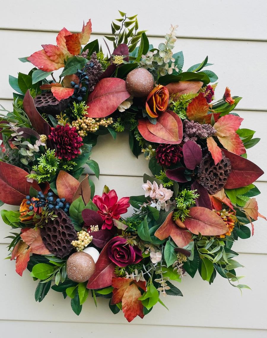 The style of this wreath is best described as elegant and natural, with a focus on rich, bold colors. Its seasonality is perfect for decorating your home throughout the entire autumn season and transitioning into winter.