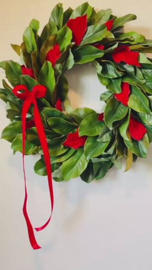 This elegant wreath brings classic holiday beauty to your home with its rich textures and traditional colors. It features a full, layered design of large, glossy magnolia leaves in deep green, complemented by strategically placed accents of vibrant, velvety red leaves that mimic festive poinsettias or felt. The smooth, deep green foliage gives the wreath a lush, high-end look.