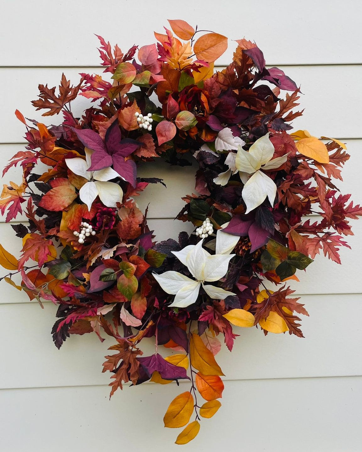 The style of this wreath is best described as traditional and rustic, with a sophisticated touch from the contrasting white blooms. Its seasonality is perfect for decorating throughout the entire fall season.